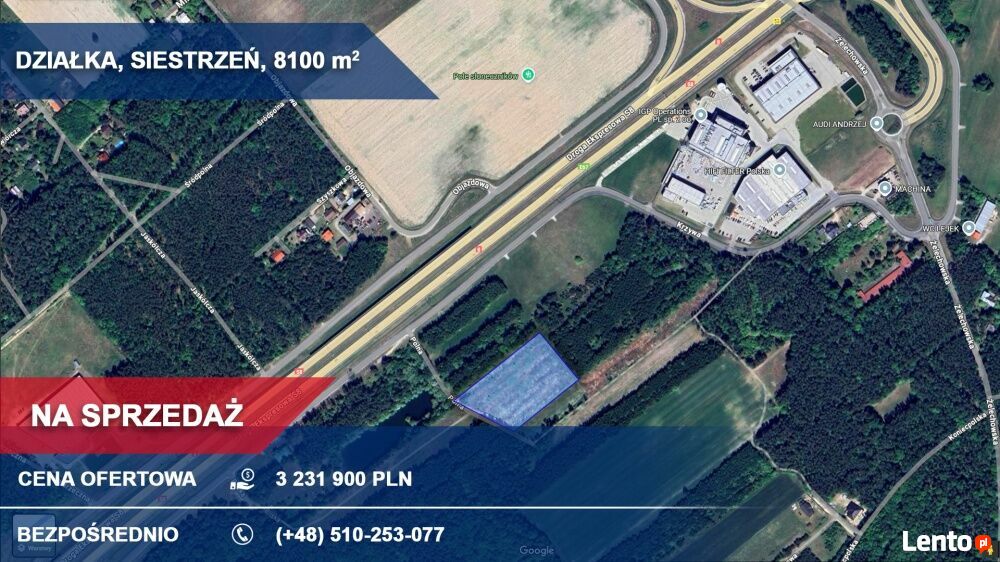 Oferuję na sprzedaż atrakcyjną działkę o powierzchni 8100 m², położoną w Siestrzeni, w bezpośrednim sąsiedztwie drogi ekspresowej S8. To doskonała lokalizacja inwestycyjna, idealna pod działalność przemysłową lub usługową.Podstawowe informacje: